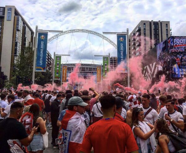Οι εικόνα έξω από το Γουέμπλεϊ, δεν παραπέμπει σε τίποτα με την πανδημία που βιώνουμε. Χιλιάδες οπαδοί της εθνικής Αγγλίας έχουν γεμίσει ασφυκτικά τον περιβάλλοντα χώρο του σταδίου. Με τα «λιοντάρια» να έχουν την ευκαιρία να κατακτήσουν για μόλις πρώτη φορά στην ιστορία τους το τρόπαιο του Euro, οι Άγγλοι βιώνουν ιστορικές στιγμές.