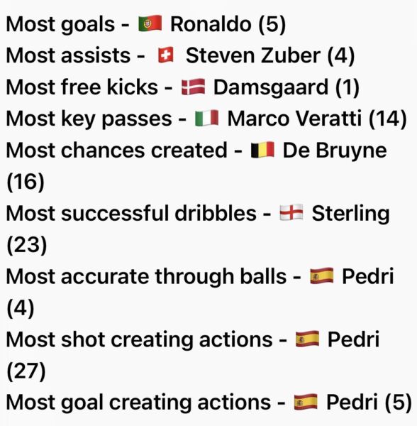 Περισσότερα γκολ, ασίστ, απευθείας φάουλ, πάσες κλειδιά, δημιουργημένες ευκαιρίες, ντρίπλες, προωθημένες πάσες, ενέργειες που οδήγησαν σε γκολ και ενέργειες που οδήγησαν σε σουτ. Στο Euro, ο Κριστιάνο Ρονάλντο σκόραρε 5 γκολ, ενώ ο Τσούμπερ μοίρασε 4 ασίστ. Το μοναδικό γκολ από φάουλ σημείωσε ο Ντάμσγκαρντ, με τον Βεράτι να βγάζει 14 πάσες κλειδιά και τον Ντε Μπρόινε να δημιουργεί 16 ευκαιρίες. Ο Στέρλινγκ με 23 ντρίπλες ήταν ο πλέον ικανός ντριμπλαδόρος και Πέδρι σε θέμα δημιουργίας ηγήθηκε σε 3 κατηγορίες.