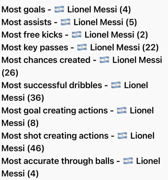 Αριθμοί σπουδαίοι σε κάθε περίπτωση. Ειδικά αυτοί του μόλις 18χρονου Πέδρι, ο οποίος έβαλε τα γυαλιά σε όλους τους μεγάλους του τουρνουά. Ο Μέσι κέρδισε την διοργάνωση, κάνοντας πραγματικά τα πάντα για την εθνική ομάδα της Αργεντινής. Όλες οι κατηγορίες που προαναφέραμε, έχουν τον Αργεντινό σούπερ σταρ στην κορυφή! Οι αριθμοί του θρύλου της Μπαρτσελόνα απλά ζαλίζουν, καθώς το τουρνουά που έκανε φέτος στην Βραζιλία απλά χωρίς ίχνος υπερβολής, δεν έχει προηγούμενο.