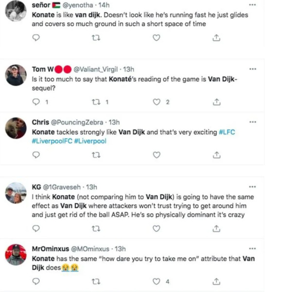 Η δύναμη του Κονατέ και το στυλ παιχνιδιού του έχουν πυροδοτήσει μία σειρά από σχόλια των φίλων της Λίβερπουλ που τον συγκρίνουν με τον Φαν Ντάικ. Πράγματι, ο Γάλλος μοιάζει να μην είναι ο πιο γρήγορος αμυντικός στον κόσμο αλλά ξαφνικά μπορεί με ένα σπριντ να φτάσει στον αντίπαλο χάρη και στον μεγάλο διασκελισμό του.