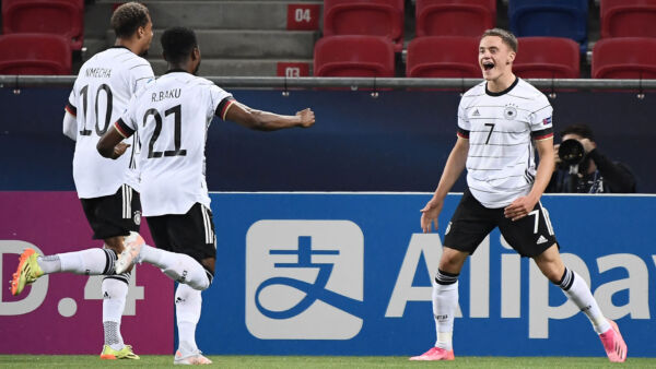 Germany’s forward Florian Wirtz (R) celebrates with teammates Germany’s forward Lukas Nmecha and Germany’s defender Ridle Baku scoring the second goal for his team during the UEFA Under21 Championship semi final football match between the Netherlands and Germany in Szekesfehervar, on June 3, 2021. (Photo by Attila KISBENEDEK / AFP) (Photo by ATTILA KISBENEDEK/AFP via Getty Images)