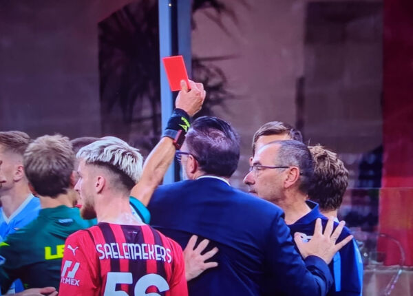 Όμως λίγο πριν ολοκληρωθεί το παιχνίδι, υπήρξαν ακόμα μερικά ντράβαλα. Και πρωταγωνιστής ήταν ο… όχι και τόσο ψύχραιμος προπονητής της Λάτσιο, Μαουρίτσιο Σάρι. Τι ήταν αυτό που προκάλεσε την έκρηξη του πολύπειρου τεχνικού; Ο μέσος της Μίλαν, Αλέξις Σαλεμάκερς, ακριβώς με την ολοκλήρωση της αναμέτρησης φαίνεται πως είχε προκλητική συμπεριφορά μπορστά από τον πάγκο των φιλοξενούμενων. Έξαλλος, ο Σάρι πετάχτηκε από την θέση του και ξεκίνησε να μιλά σε έντονο ύφος με τον Βέλγο ποδοσφαιριστή.