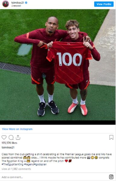 «Σπουδαία κίνηση από τον σύλλογο να βγάλει φανέλα για όλα τα γκολ που έχω σκοράρει εγώ μαζί με τον Μο στην Premier League. Οκ, ίσως έχει μεγαλύτερη συνεισφορά από μένα. Συγχαρητήρια Αιγύπτιε βασιλιά, θρύλος εντός κι εκτός γηπέδου».