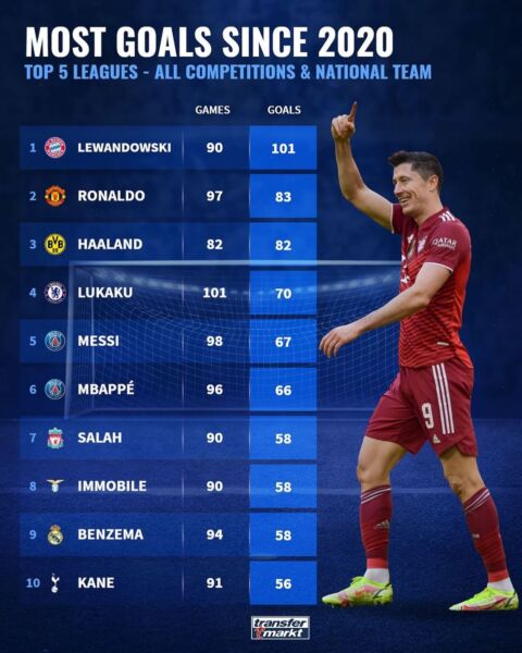 H Μπάγερν Μονάχου διαθέτει την απόλυτη μηχανή γκολ. Τον άνθρωπο που σε κάθε παιχνίδι ανεξαρτήτως αντιπάλου θα σκοράρει τουλάχιστον μία φορά. Οι αριθμοί του είναι αδιάψευστοι μάρτυρες. Λένε την αλήθεια, και αυτή είναι πως ο Λεβαντόφσκι είναι το πιο ηχηρό κανόνι της εποχής μας. Από το ξεκίνημα του 2020 ως σήμερα ο Πολωνός έχει καταφέρει να βρει τα αντίπαλα δίχτυα 101 φορές σε 90 παιχνίδια. Σκοράρει δηλαδή κάτι παραπάνω από ένα τέρμα ανά συμμετοχή.