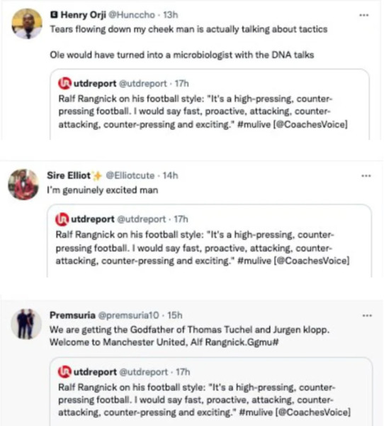 Οι οπαδοί της Γιουνάιτεντ, φυσικά, ξετρελάθηκαν όταν έμαθαν τις τακτικές που θέλει να περάσει στην ομάδα τους ο Ράνγκνικ. Έτσι, μέσω του twitter εκδήλωσαν τον ενθουσιασμό τους.