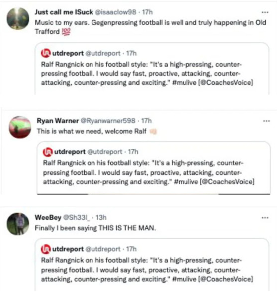 Οι οπαδοί της Γιουνάιτεντ, φυσικά, ξετρελάθηκαν όταν έμαθαν τις τακτικές που θέλει να περάσει στην ομάδα τους ο Ράνγκνικ. Έτσι, μέσω του twitter εκδήλωσαν τον ενθουσιασμό τους.