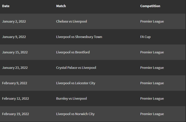 Θα μπορούσαν επίσης να χάσουν την ευκαιρία να αντιμετωπίσουν την Τσέλσι στην Πρέμιερ Λιγκ στις 2 Ιανουαρίου, καθώς ίσως χρειαστεί να φύγουν νωρίς από την ομάδα της Λίβερπουλ για να παραβρεθούν στην προετοιμασία της ομάδας τους. Τα παιχνίδια που αναμένεται σίγουρα να χάσουν είναι η αναμέτρηση του τρίτου γύρου του Κυπέλλου Αγγλίας με τη Σρούσμπερι Τάουν καθώς και τα παιχνίδια της Πρέμιερ Λιγκ εναντίον της Κρίσταλ Πάλας και της Λέστερ. Ωστόσο, μπορεί να επιστρέψουν για να αντιμετωπίσουν την Μπέρνλι.