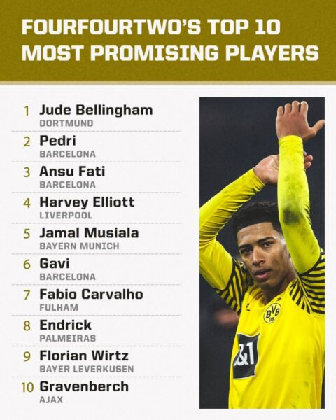Στο νούμερο 4, ο Χάρβει Έλιοτ. Στο 3 Άνσου Φάτι, 2 Πέδρι και στην κορυφή ο Τζουντ Μπέλιγχαμ. Δεν χρειάζονται συστάσεις για τους τέσσερις τελευταίους.