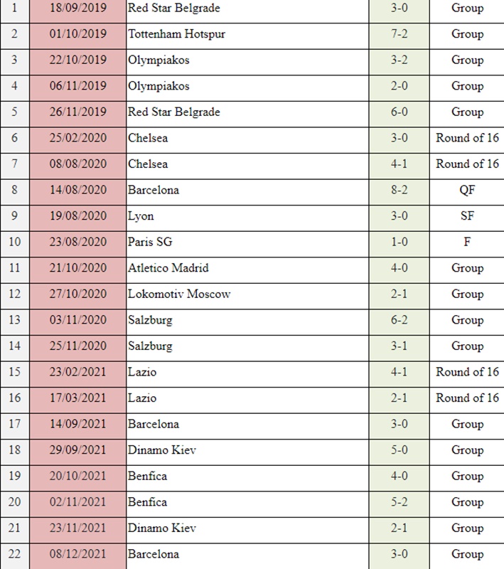 Το τρομερό σερί του Λεβαντόφσκι διήρκεσε από τις 18 Σεπτεμβρίου 2019 έως τις 8 Δεκεμβρίου 2021. Μέσα σε αυτήν τη χρονική περίοδο, υπήρξαν 2 αγώνες Champions League που η Μπάγερν δεν έχει κερδίσει. Το 1-1 εναντίον Ατλέτικο την 1η Δεκεμβρίου 2020 και το 2-3 εναντίον Παρί στις 7 Απριλίου 2021. Αλλά και στις δύο περιπτώσεις ο Λεβαντόφσκι ήταν εκτός ομάδας. Ο προηγούμενος κάτοχος του ρεκόρ σε αυτή την κατηγορία ήταν ο συμπαίκτης του Λεβαντόφσκι, Μάνουελ Νόιερ (17 συνεχόμενες νίκες στο Champions League μεταξύ Σεπτεμβρίου 2019 και Φεβρουαρίου 2021).