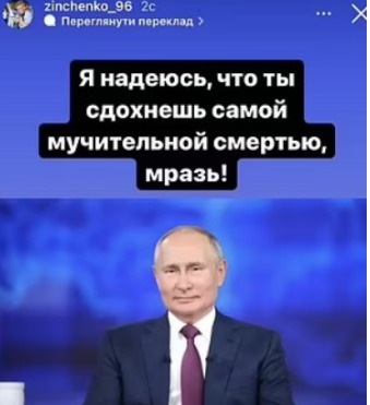«Δεν μπορώ να μείνω να κοιτάζω όσα γίνονται δίχως να μιλάω, τη στιγμή που όλος ο πολιτισμένος κόσμος ενδιαφέρεται για την πατρίδα μου» ανέφερε και στο ποστάρισμά του είχε βάλει μια φωτογραφία του Πούτιν και έγραφε: «Ελπίζω να πεθάνεις με τον χειρότερο τρόπο, κάθαρμα!»