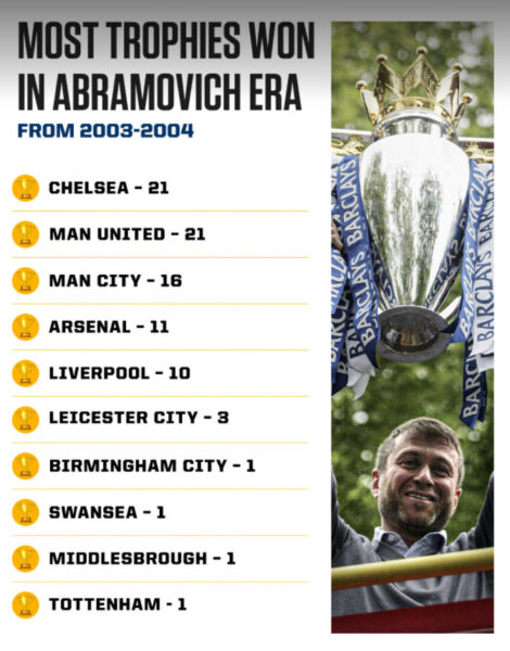 Ο Ρώσος μπίζνεσμαν μπορεί να είναι περήφανος για τα όσα αφήνει προίκα στην Τσέλσι. Επί θητείας του, η Τσέλσι ήταν η πιο επιτυχημένη ομάδα από πλευράς τίτλων μαζί με τη Μάντσεστερ Γιουνάιτεντ.