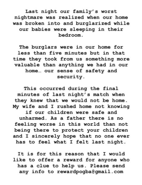 Ο Πογκμπά, ο οποίος προσφέρει αμοιβή για οποιαδήποτε πληροφορία, πρόσθεσε ότι ενημερώθηκε για τη διάρρηξη μετά τον αγώνα: «Η γυναίκα μου και εγώ τρέξαμε σπίτι χωρίς να γνωρίζουμε αν τα παιδιά μας ήταν ασφαλή. Ως πατέρας δεν υπάρχει χειρότερο συναίσθημα σε αυτόν τον κόσμο από το να μην είσαι εκεί για να προστατεύεις τα παιδιά σου και ειλικρινά ελπίζω να μην χρειαστεί ποτέ κανείς να νιώσει αυτό που ένιωσα το προηγούμενο βράδυ».