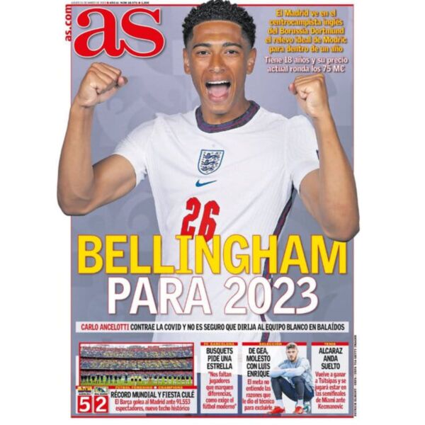 Το σημερινό πρωτοσέλιδο της ισπανικής AS είναι αφιερωμένο στη Ρεάλ Μαδρίτης και τον Τζουντ Μπέλινγχαμ. Η «Βασίλισσα» έχει βάλει για τα καλά στη λίστα της τον ταλαντούχο χαφ. Σύμφωνα με το ρεπορτάζ ο άσσος της Ντόρτμουντ είναι ο υπ’ αριθμόν ένα στόχος για την αντικατάσταση του Λούκα Μόντριτς. Η μεταγραφή του ωστόσο κατά πάσα πιθανότητα θα πραγματοποιηθεί το καλοκαίρι του 2023.