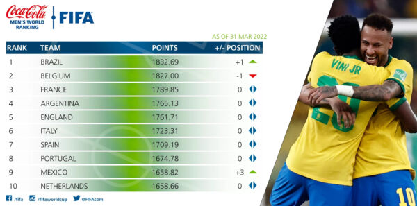 Σαν να μην έφτανε αυτό, η «Σελεσάο» προέβη και σε ένα ακόμη σημαντικό επίτευγμα. Πέντε χρόνια είχε να δει κορυφή σε λίστα της FIFA και το έκανε τώρα! Εκθρόνισε από την πρώτη θέση το Βέλγιο που βρισκόταν ανελλιπώς εκεί τα τελευταία χρόνια. Έχει πλέον 1832,69 πόντους, με τους Βέλγους να είναι στους 1827. Το βάθρο συμπληρώνει η Γαλλία, με την Αργεντινή να ακολουθεί στην τέταρτη θέση. Η φιναλίστ του περσινού Euro, Αγγλία είναι 5η, ενώ μια θέση πιο κάτω βρίσκεται η πρωταθλήτρια Ευρώπης, Ιταλία.