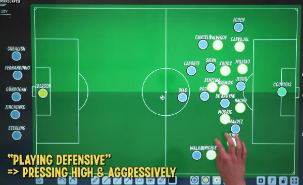 Όσον αφορά το πρέσινγκ, η Σίτι πίεσε ασφυκτικά τη Ρεάλ Μαδρίτης σε σχηματισμό 4-4-2, με συνέπεια να καταφέρει στις περισσότερες περιπτώσεις να κλέψει τη μπάλα ψηλά στο γήπεδο. Οι καλύτερες φάσεις της Σίτι ήρθαν απέναντι σε οργανωμένη άμυνα και μετά από αδράνειες του αμυντικού κεντρικού διδύμου (Λαπόρτ, Ντίαζ. Το πρέσινγκ εμπεριείχε ρίσκο δεδομένου ότι η γραμμή της άμυνας της Σίτι βρισκόταν πολύ ψηλά. Ωστόσο, η παρουσία του Γουόκερ στο δεξί άκρο της άμυνας έλυνε τα χέρια του Γκουαρντιόλα. Ο Άγγλος έκανε αυτό που δεν πέτυχε ο Φερναντίνιο στον πρώτο αγώνα, καταφέρνοντας να κερδίσει τις περισσότερες μονομομαχίες με τον Βινίσιους.