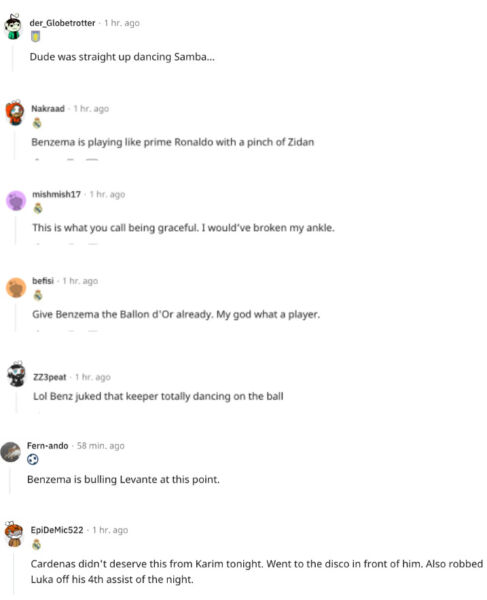 Αν και είναι δύσκολο να ξεχωρίσεις ένα γκολ, το 5-0 ίσως ήταν το πιο εντυπωσιακό της αναμέτρησης. Η φάση ξεκινάει από μία κάθετη πάσα – ξυραφιά του Λούκα Μόντριτς προς τον Καρίμ Μπενζεμά. Τότε, ο Γάλλος βρέθηκε αντιμέτωπος με τον τερματοφύλακα και άρχισε να τον «χορεύει» με μερικές ντρίμπλες που θύμισαν τον Ρονάλντο Ναζάριο.