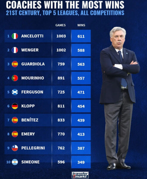 Το transfermarkt κατέταξε όλους τους προπονητές με βάση τον αριθμό των νικών τους στον 21ο αιώνα στα πέντε κορυφαία πρωταθλήματα. Ιδού το τελικό αποτέλεσμα