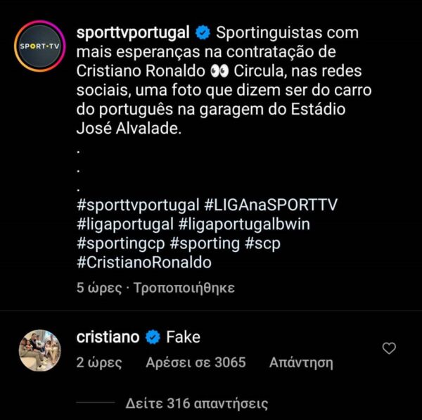 Πού να ήξερε πως η κίνησή της αυτή θα επέφερε τέτοιες συνέπειες. Ο Ρονάλντο πάντως, έσπευσε να «σβήσει» τη φουντωμένη φλόγα, με ένα σχόλιο στη δημοσίευση του πορτογαλικού καναλιού. «FAKE», ήταν συγκεκριμένα η απάντησή του στα όποια σενάρια τον συνδέουν με τη Σπόρτινγκ.