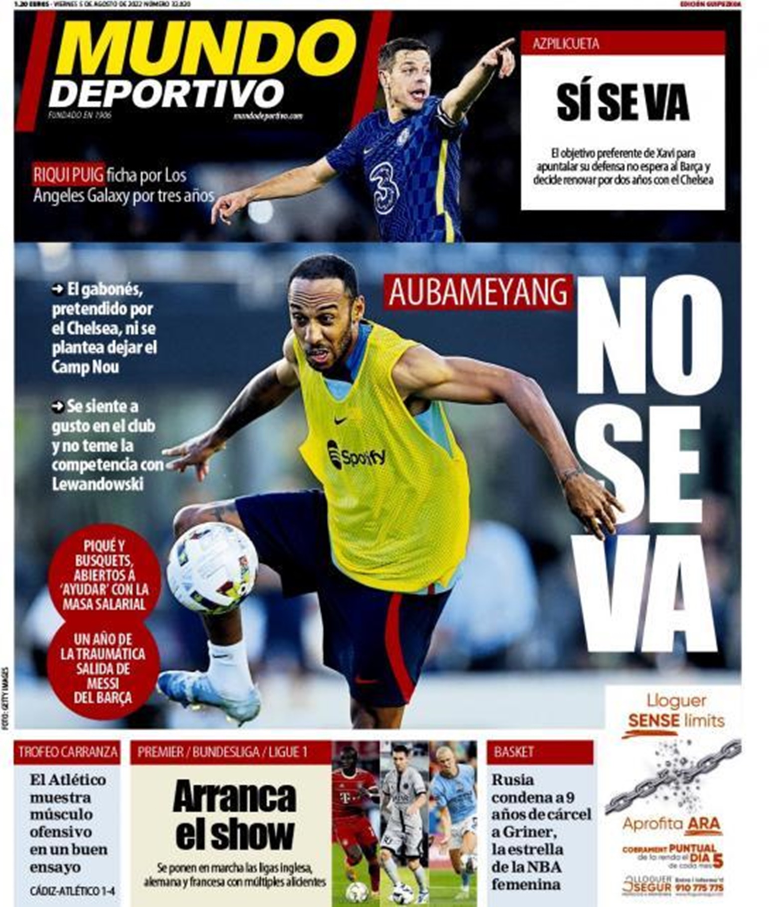 Παρόλα αυτά και το όνομα του Πιερ Εμερίκ Ομπαμεγιάνγκ βρίσκεται τις τελευταίες ώρες στο ρεπορτάζ των Λονδρέζων. Ωστόσο, οι φίλοι της Μπαρτσελόνα δεν θα πρέπει να ανησυχούν. Τουλάχιστον αυτό αναφέρει με το πρωτοσέλιδό της η καταλανική εφημερίδα «Mundo Deportivo».