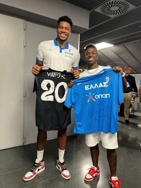 Ο Βινίσιους περίμενε τον Έλληνα σούπερ σταρ του NBA στα αποδυτήρια και εκεί του πρόσφερε τη φανέλα του από τη Ρεάλ Μαδρίτης. Ο Γιάννης Αντετοκούνμπο φωτογραφήθηκε με τον νεαρό επιθετικό των Μαδριλένων και του χάρισε με τη σειρά του τη δική του φανέλα.