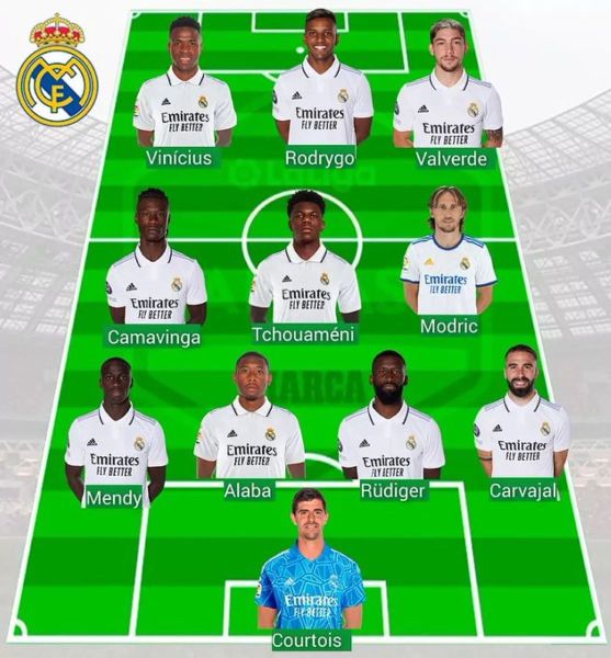 Στην αμυντική γραμμή, στα φτερά συναντάμε τους Μεντί αριστερά και Καρβαχάλ δεξία. Στο κέντρο της άμυνας ο Αντσελότι αναμένεται να χρησιμοποιήσει το δίδυμο Αλάμπα – Ρούντιγκερ μιας και ο Μιλιτάο κρίνεται ανέτοιμος. Στα χαφ η Ρεάλ θα παίξει με τους Καμαβινγκά, Τσουαμενί και Μόντριτς. Η επίθεση της τέλος θα αποτελείται από τους Βινίσιους, Ροντρίγκο και Βαλβέρδε.