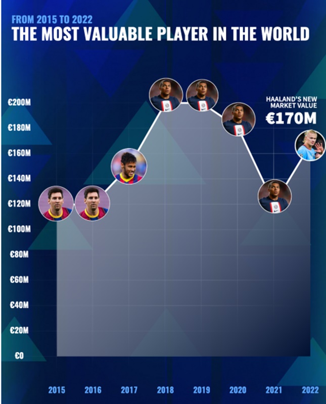 O Έρλινγκ Χάαλαντ ξεπέρασε τον Κιλιάν Μπαπέ και είναι πλέον, με εκτιμώμενη αξία 170 εκατομμύρια ευρώ, ο ακριβότερος ποδοσφαιριστής στον κόσμο, σύμφωνα με την εξειδικευμένη ιστοσελίδα transfermarkt. Με τον Γάλλο σούπερ σταρ της Παρί Σεν Ζερμέν να υπολείπεται κατά 10 εκατομμυρίων ευρώ. Αυτό συνέβη, όπως εξηγεί η ιστοσελίδα, μετά την ενημέρωση της αξίας των παικτών στην Premier League.
