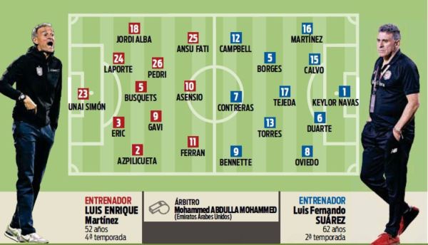 Κατά το ρεπορτάζ του καταλανικού ΜΜΕ, οι έντεκα που θα παρουσιάσει ο Λουίς Ενρίκε στο παιχνίδι με τη Κόστα Ρίκα είναι οι εξής: Ουνάι Σιμόν, Ζόρντι Άλμπα, Λαπόρτ, Έρικ Γκαρσία, Αθπιλικουέτα, Μπούσκετς, Γκάβι, Πέδρι, Άνσου Φάτι, Ασένσιο και Φεράν Τόρες. Μένει να δούμε αν επιβεβαιωθεί!