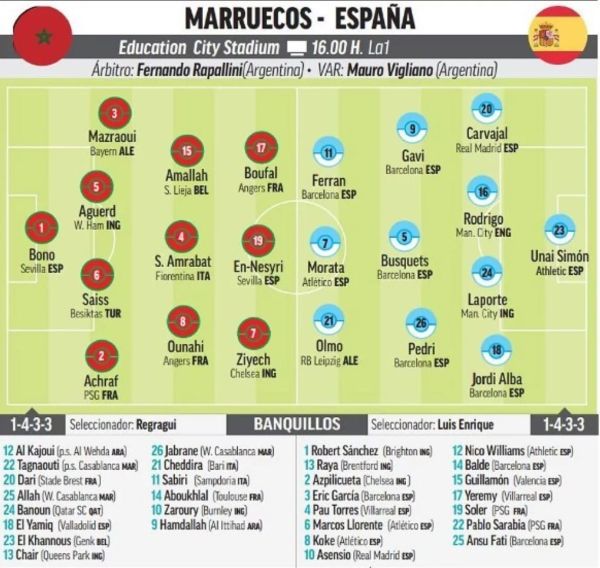 Ρεγκράγκουι και Λουίς Ενρίκε έχουν ήδη στο μυαλό τους τους έντεκα που θα ρίξουν πρώτους στην αρένα. Σύμφωνα με την MARCA οι Μαροκινοί δεν αναμένεται να έχουν εκπλήξεις στην ενδεκάδα τους. Όσον αφορά την Ισπανία, ο Λουίς Ενρίκε πηγαίνει και αυτός σε σταθερές του. Σε ένα ακόμη παιχνίδι θα εμπιστευτεί έμπειρους ποδοσφαιριστές για την άμυνά του. Ο Ουνάι Σιμόν θα βρίσκεται κάτω από τα δοκάρια. Στην άμυνα ο Ενρίκε παρατάσσει τετράδα αποτελούμενη από τους Καρβαχάλ, Ροντρίγκο, Λαπόρτ και Ζόρντι Άλμπα. Στη μεσαία γραμμή δεσπόζουν σε ένα ακόμη ματς οι Μπούσκετς, Γκάβι και Πέδρι. Τέλος στην επίθεση πιθανότατα θα δούμε τριάδα με τους Μοράτα κορυφή και Φεράν Τόρες – Όλμο στις πτέρυγες.