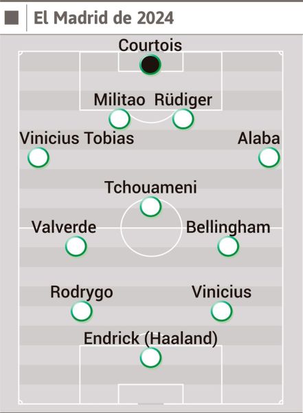 Η παρακάτω φωτογραφία δείχνει την ενδεκάδα της Ρεάλ Μαδρίτης όπως ακριβώς την ονειρεύεται ο Φλορεντίνο Πέρεθ. Κάτω από τα δοκάρια θα βρίσκεται ο Τιμπό Κουρτουά. Στο κέντρο της άμυνας οι Μιλιτάο και Ρούντιγκερ. Στα φτερά της αμυντικής τετράδας οι Βινίσιους Τόμπιας και Αλάμπα. Η μεσαία γραμμή θα απαρτίζεται από τους Τσουαμενί, Βαλβέρδε και Μπέλινγχαμ. Τέλος στην επίθεση η τριάδα θα έχει ως εξής: Βινίσιους Τζούνιορ και Ροντρίγκο και μπροστά τους είτε ο Έντρικ είτε ο Χάαλαντ. Όλα αυτά το καλοκαίρι του 2024!