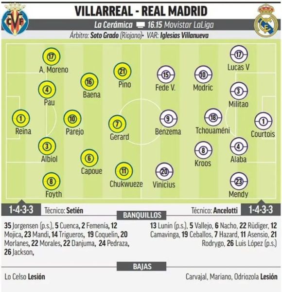 Στον χώρο του κέντρου η Ρεάλ Μαδρίτης θα παρατάξει τριάδα με τους Τσουαμενί – Κρος – Μόντριτς. Ο Αντσελότι θέλει να κυριαρχήσει στη μεσαία γραμμή γι’ αυτό τον λόγο ρίχνει στην αρένα ό,τι καλύτερο διαθέτει στα χαφ. Τέλος, στη γραμμή κρούσης η Ρεάλ Μαδρίτης πηγαίνει με τους Φεντερίκο Βαλβέρδε και Βινίσιους στα άκρα και τον Καρίμ Μπενζεμά στην κορυφή ως φουνταριστό. Η Βιγιαρεάλ από την άλλη θα βασιστεί στις σταθερές της. Πάου Τόρες στο κέντρο της άμυνας, Ζεράρ Μορένο στην επίθεση. Το «κίτρινο υποβρύχιο» θα προσπαθήσει να ανακόψει τα ατού της Ρεάλ Μαδρίτης και να επιβάλει τον δικό του ρυθμό στον αγώνα. Δύσκολη αποστολή για τη Βιγιαρεάλ!