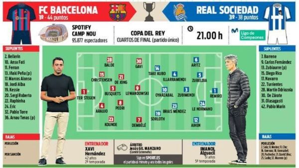 Αυτοί είναι οι έντεκα που αναμένεται να παρατάξει ο Τσάβι στο αποψινό κρίσιμο ραντεβού ανάμεσα σε Μπαρτσελόνα και Ρεάλ Σοσιεδάδ.
