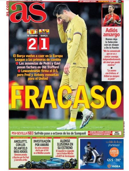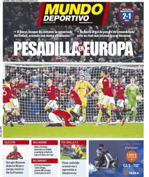 SPORT, AS και Mundo Deportivo περιγράφουν με λίγες λέξεις στα πρωτοσέλιδά τους το κλίμα που επικρατεί στην Μπαρτσελόνα μετά την αποτυχία του Ολντ Τράφορντ. «Αποτυχία», «Εφιάλτης στην Ευρώπη» και «Τι απογοήτευση» γράφουν χαρακτηριστικά.