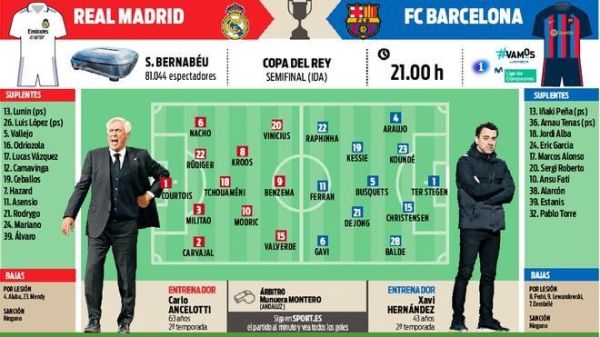 Απόψε τα σπουδαία στο Σαντιάγκο Μπερναμπέου! Ρεάλ Μαδρίτης και Μπαρτσελόνα διασταυρώνουν τα ξίφη τους στη πρώτη μεταξύ τους μάχη στα ημιτελικά του Copa del Rey. Η σειρά ξεκινά από τη Μαδρίτη απόψε, σε ένα παιχνίδι και οι δύο ομάδες θέλουν να αποκτήσουν πλεονέκτημα ενόψει του επαναληπτικού στο Καμπ Νου. Κάρλο Αντσελότι και Τσάβι τα τελευταία 24ωρα καταστρώνουν τα σχέδιά τους για το σπουδαίο παιχνίδι.