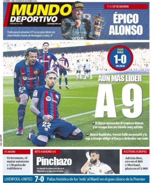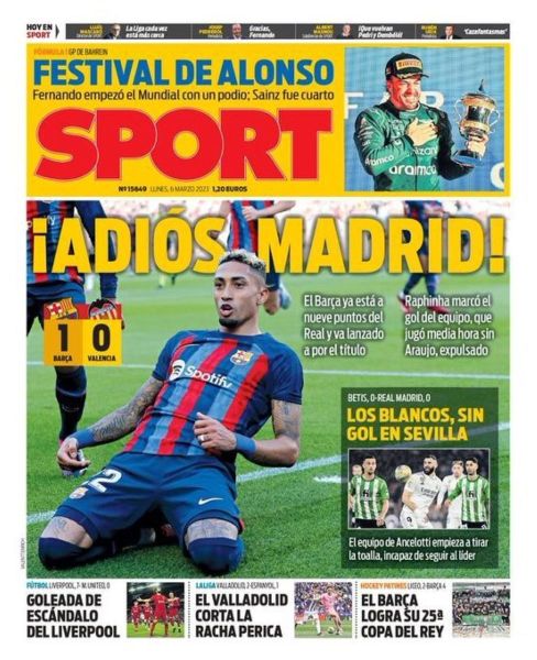 Στη Βαρκελώνη τα πρωτοσέλιδα της Mundo Deportivo και της SPORT είναι αφιερωμένα στη μάχη μεταξύ των δύο μεγάλων του ισπανικού ποδοσφαίρου. Αμφότερα με τους τίτλους τους υπερτονίζουν τη διαφορά στη βαθμολογία. H SPORT αποχαιρετά τη Ρεάλ Μαδρίτης, ενώ η Mundo τονίζει το +9 μια διαφορά που χρήζει τη Μπαρτσελόνα ως το μεγάλο φαβορί για το πρωτάθλημα
