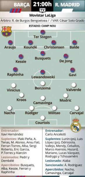 Αμφότεροι προσανατολίζονται να παίξουν παρατάσσοντας το ίδιο σχήμα. 4-3-3! Η Μπαρτσελόνα σύμφωνα με τον ισπανικό Τύπο αναμένεται να αγωνιστεί με τους εξής έντεκα: Ο τερ Στέγκεν κάτω από τα δοκάρια. Στην άμυνα, Κουντέ και Κρίστενσεν στα στόπερ, με τους Αραούχο και Μπαλντέ στις πτέρυγες. Στον χώρο της μεσαίας γραμμής ο Τσάβι θα χρησιμοποιήσει τους Μπούσκετς- Κεσιέ – Ντε Γιονγκ. Τέλος στη γραμμή κρούσης η Μπαρτσελόνα θα παίξει με τους Ραφίνια, Γκάβι και Λεβαντόφσκι.