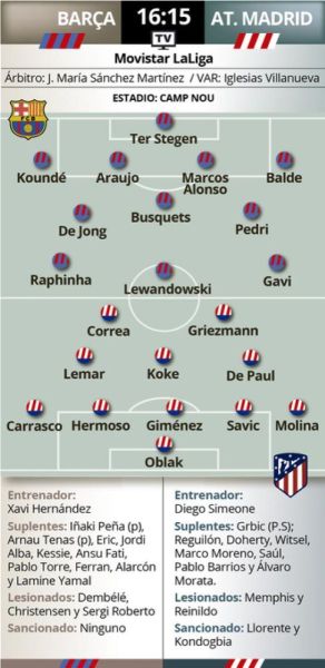 Η ενδεκάδα της Μπαρτσελόνα δεν θα έχει μεγάλες εκπλήξεις. Ο Μαρκ Τερ Στέγκεν θα υπερασπιστεί την εστία των «μπλαουγκράνα». Στην άμυνα ο Τσάβι θα χρησιμοποιήσει τους Κουντέ δεξιά, Αραούχο και Μάρκος Αλόνσο στο κέντρο και τον Μπαλντέ στα αριστερά. Στη μεσαία γραμμή η Μπαρτσελόνα θα κατέβει με τριάδα τους Μπούσκετς – Πέδρι – Ντε Γιονγκ. Τέλος στην επίθεση ο Τσάβι θα ρίξει στη μάχη τους Ραφίνια, Λεβαντόφσκι και Γκάβι. Ο τελευταίος θα έχει ουσιαστικά διπλό ρόλο σε κέντρο και επίθεση.