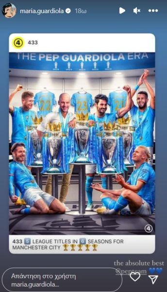 Ο Πεπ Γκουαρντιόλα πέτυχε τον 33ο τίτλο στην καριέρα του, καθώς κατέκτησε το πρωτάθλημα με τη Μάντσεστερ Σίτι για τρίτη συνεχόμενη χρονιά και πέμπτη συνολικά με την ομάδα. Ο Ισπανός προπονητής οδήγησε επίσης τη Σίτι στον τελικό του Champions League, που θα διεξαχθεί στις 10 Ιουνίου αντιμετωπίζοντας την Ίντερ. Η απαστράπτουσα ομολογουμένως κόρη του προπονητή της Σίτι, Μαρία, τον αποθέωσε μέσω Instagram story, αναφέροντας: «Είναι απόλυτα ο καλύτερος».