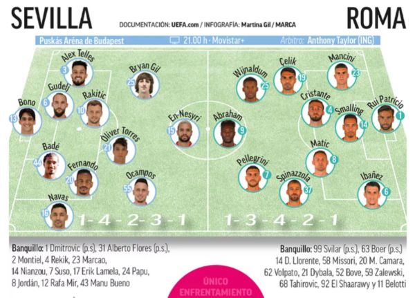 Μέχρι χθες ο Μουρίνιο δεν ήξερε αν θα μπορούσε να υπολογίζει στον Πάουλο Ντιμπάλα. Ο Αργεντινός τελικά θα είναι διαθέσιμος για τη μεγάλη μάχη όμως πιθανότατα να τον δούμε να ξεκινάει τον τελικό από τον πάγκο. Στο απέναντι στρατόπεδο, η Σεβίλλη θα έχει στην ενδεκάδα της τα περισσότερα αστέρια της. Με τον Εν Νεσίρι στη γραμμή κρούσης και τους έμπειρους Ράκιτιτς και Φερνάντο στα χαφ.