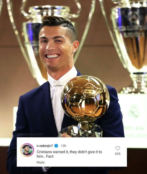 Όπως συνέβη και με την περίπτωση του Νεμάνια Ράντονιτς. Ο Σέρβος αμυντικός που αγωνίζεται στην Τορίνο έγραψε συγκεκριμένα: «Η διαφορά μεταξύ του Κριστιάνο Ρονάλντο με τον Λιονέλ Μέσι είναι ότι ο Κριστιάνο κατέκτησε με το σπαθί του κάθε “Χρυσή Μπάλα”, ενώ του Μέσι τους τη χάρισαν». Αυτό ήταν το σχόλιό του, όπου και έγινε άμεσα viral. Κριστιάνο Ρονάλντο: Βρήκε και πάλι το χαμόγελό του!