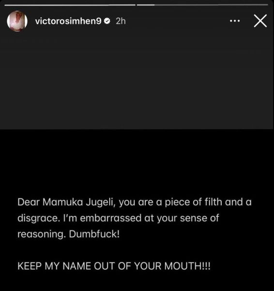 Λίγες ώρες αργότερα ο Νιγηριανός επιθετικός της Νάπολι πληροφορούμενος τα όσα ειπώθηκαν ξέσπασε μέσω story από το προσωπικό του Instagram. «Αγαπητέ Μαμούκα Τζουγκέλι, είσαι ένα κομμάτι βρωμιάς και ντροπής. Ντρέπομαι για την αίσθηση συλλογισμού που έχεις. Βλάκα! Μην ξαναπιάσεις το όνομα μου στο στόμα σου», τόνισε ο Όσιμεν.
