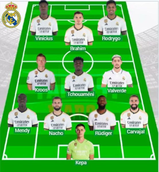 Το ρεπορτάζ της ισπανικής MARCA αποκαλύπτει τα σχέδια του Αντσελότι για τον αυριανό αγώνα. Η ενδεκάδα του Ιταλού τεχνικού θα αποτελείται – πιθανότατα – από τους εξής: Κάτω από την εστία θα βρίσκεται ο Κέπα. Στην άμυνα η Ρεάλ Μαδρίτης θα παραταχθεί με τους Μεντί, Νάτσο, Ρούντιγκερ και Καρβαχάλ. Στη μεσαία γραμμή ο Ιταλός σκέφτεται να χρησιμοποιήσει τους Κρόος, Τσουαμενί και Βαλβέρδε. Τέλος, στην επίθεση οι Μαδριλένοι θα έχουν τους Βινίσιους, Ροντρίγκο και Μπραχίμ Ντίαζ. Ο τελευταίος θα έχει ελεύθερο ρόλο. Παίρνει τη θέση του Τζουντ Μπέλινγχαμ στο βασικό σχήμα!