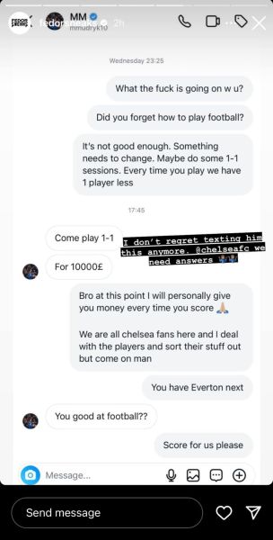 Ο παίκτης της Τσέλσι απάντησε και μάλιστα προκάλεσε τον παίκτη σε μονό για 10.000 λίρες. «Έλα να παίξουμε 1 vs 1. Για 10.000 λίρες» έγραψε, με τον οπαδό να απαντάει ξανά. «Αδελφέ σε αυτό το σημείο θα σου δώσω εγώ προσωπικά χρήματα κάθε φορά που σκοράρεις. Είμαστε όλοι οπαδοί της Τσέλσι και καταλαβαίνω τους παίκτες και τα πράγματά του αλλά έλα ρε φίλε. Θα πας στην Έβερτον».Η συνομιλία τους δεν ολοκληρώθηκε εκεί με τον Μούντρικ να ρωτάει «Είσαι καλός στο ποδόσφαιρο;;;» και τον φίλαθλο να απαντάει «Σκόραρε για εμάς σε παρακαλώ».