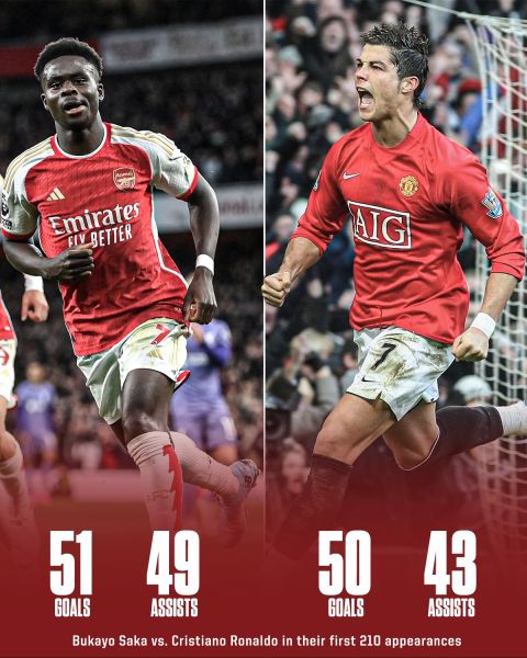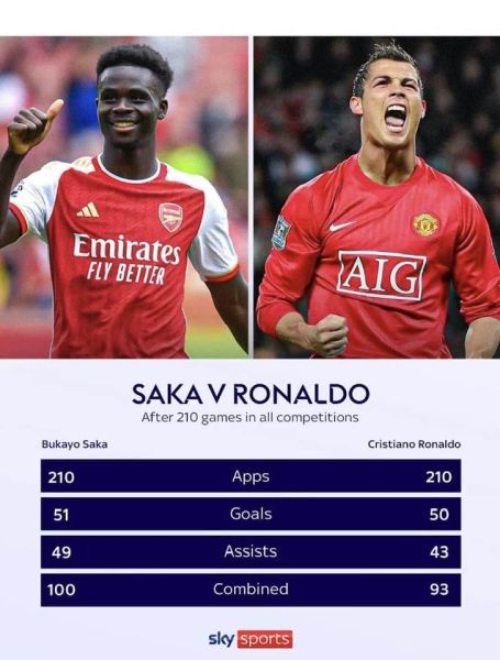 Ο Μπουκάγιο Σάκα, όμως, με τα νούμερα που έχει ήδη μπορεί να κοιτάξει στα μάτια έναν από τους καλύτερους που πέρασαν και άφησαν το στίγμα τους στην Premier League. Ο λόγος για τον Κριστιάνο Ρονάλντο. Μάλιστα, το «ESPN» και το «Sky Sports» με μία σειρά στατιστικών απέδειξαν ότι νεαρός σούπερ σταρ της Άρσεναλ έχει καλύτερα νούμερα από τον Πορτογάλο φορ μετά από 210 ματς που έχουν παίξει και οι δυο τους!