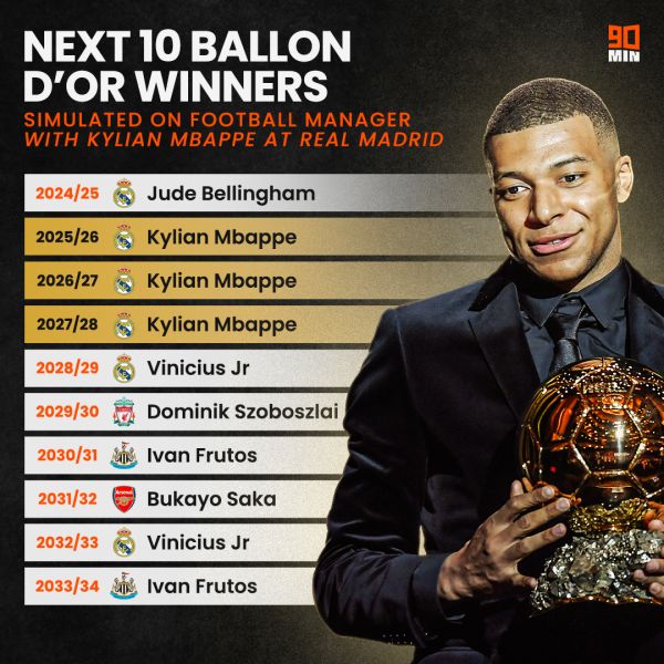 Σύμφωνα με το «Football Manager» εκείνος που θα γίνει… χρυσός είναι ο Κιλιάν Μπαπέ. Ο Γάλλος στράικερ, όχι μόνο θα πάρει μεταγραφή στη Ρεάλ Μαδρίτης, αλλά για τρία χρόνια σερί να βρίσκεται στην κορυφή. Όμως, δεν θα είναι ο μοναδικός παίκτης από την ισπανική ομάδα που θα το κάνει αυτό ή που θα ζήσει αυτή την εμπειρία, αφού από κοντά είναι και ο Βινίσιους Τζούνιορ με δύο. Όπως και ο Τζουντ Μπέλιγχαμ. Κιλιάν Μπαπέ: Στα χνάρια του Μέσι και του Κριστιάνο για τη «Χρυσή Μπάλα»