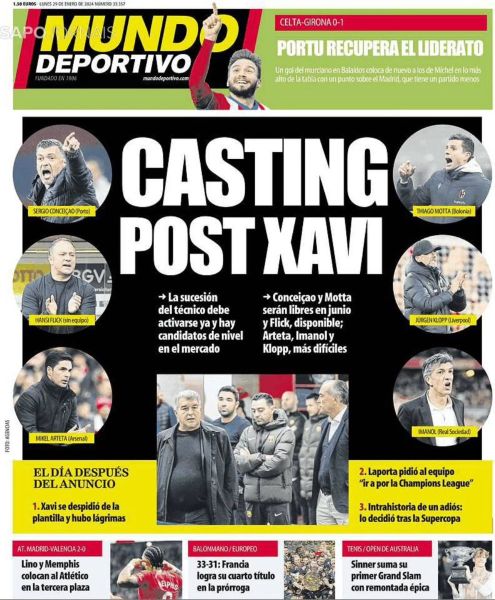 Η Mundo αποκαλύπτει πως ο Ντέκο τις τελευταίες ώρες βρίσκεται σε συνεχείς επαφές με κορυφαίους προπονητές της αγοράς. Πρώτο φαβορί για τη διαδοχή του Τσάβι – αν υπάρξει θέμα αποχώρησης – είναι ο Σέρχιο Κονσεισάο της Πόρτο. Ο Πορτογάλος τεχνικός ολοκληρώνει τη συνεργασία του με τους «Δράκους» με το φινάλε της σεζόν και μένει ελεύθερος αναζητώντας νέο προορισμό για την καριέρα του. Δεύτερος στη λίστα είναι ο Χάνσι Φλικ και με σειρά ακολουθούν οι δύσκολες ως απίθανες περιπτώσεις των Μίκελ Αρτέτα, Τιάγκο Μότα, Γιούργκεν Κλοπ και Ιμανόλ Ανκουαθίλ της Ρεάλ Σοσιεδάδ.