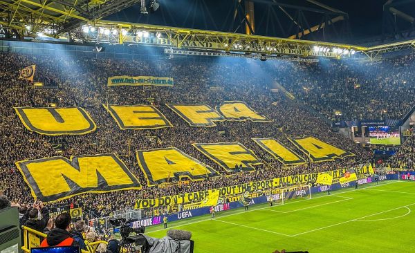 Το πανό των φίλων της Μπορούσια Ντόρτμουντ έγραφε: «ΟΥΕΦΑ ΜΑΦΙΑ… Δεν σας νοιάζει το άθλημα. Το μόνο που σας νοιάζει είναι το χρήμα».