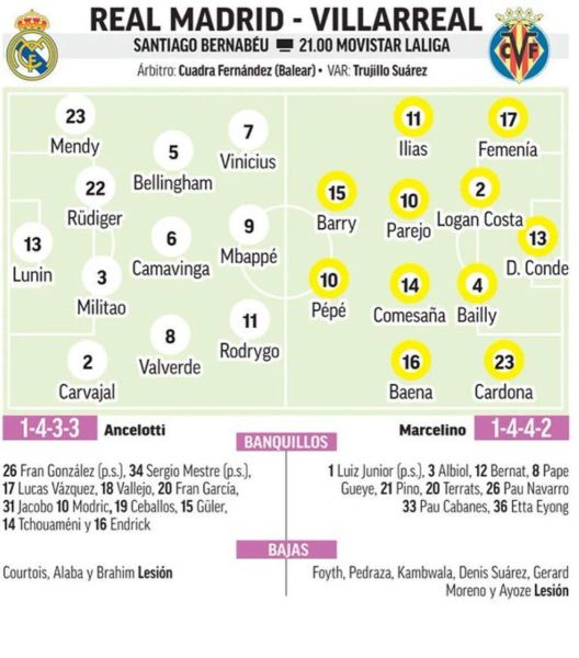 Ευκαιρία να ανέβει στη κορυφή της La Liga η Ρεάλ Μαδρίτης. Έστω και προσωρινά. Οι Μαδριλένοι υποδέχονται απόψε το βράδυ (22:00) στο Σαντιάγκο Μπερναμπέου την μαχητική Βιγιαρεάλ στα πλαίσια της 9ης αγωνιστικής της La Liga. Ο Κάρλο Αντσελότι και οι ποδοσφαιριστές του θέλουν να αφήσουν πίσω την κακή εμφάνιση μεσοβδόμαδα στη Γαλλία και την ήττα από τη Λιλ για τη League Phase του Champions League και μπροστά τους ανοίγεται η ιδανική ευκαιρία.