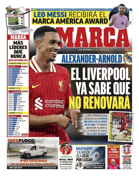 Τα πρωτοσέλιδά της είναι για πολλούς και διαφορετικούς λόγους από εκείνα που δεν περνάνε… αδιάφορα για κανέναν λόγο. Τις τελευταίες ημέρες η εν λόγω αθλητική εφημερίδα που γνωρίζει πολύ καλά πρόσωπα και καταστάσεις στη Ρεάλ Μαδρίτης φαίνεται ολοένα και πιο σίγουρη για το μέλλον του Τρεντ Αλεξάντερ Άρνολντ.