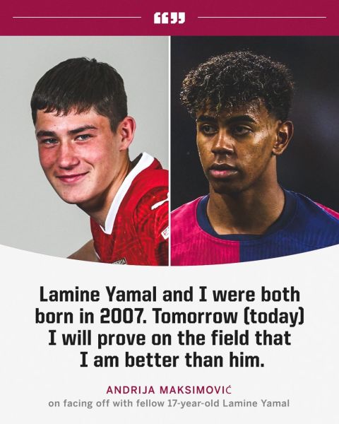 Ο Λαμίν Γιαμάλ είναι από τους ελάχιστους παίκτες που έχουν φτάσει ήδη τόσο ψηλά και είναι τόσο μικρός σε ηλικία. Ένας συνομήλικός του φρόντισε να του πετάξει το… γάντι. Ο λόγος για τον Αντρίγια Μαξίμοβιτς. Ο 17χρονος άσος του Ερυθρού Αστέρα με δηλώσεις του πριν το παιχνίδι των Σέρβων με τους Καταλανούς επισήμανε ότι: