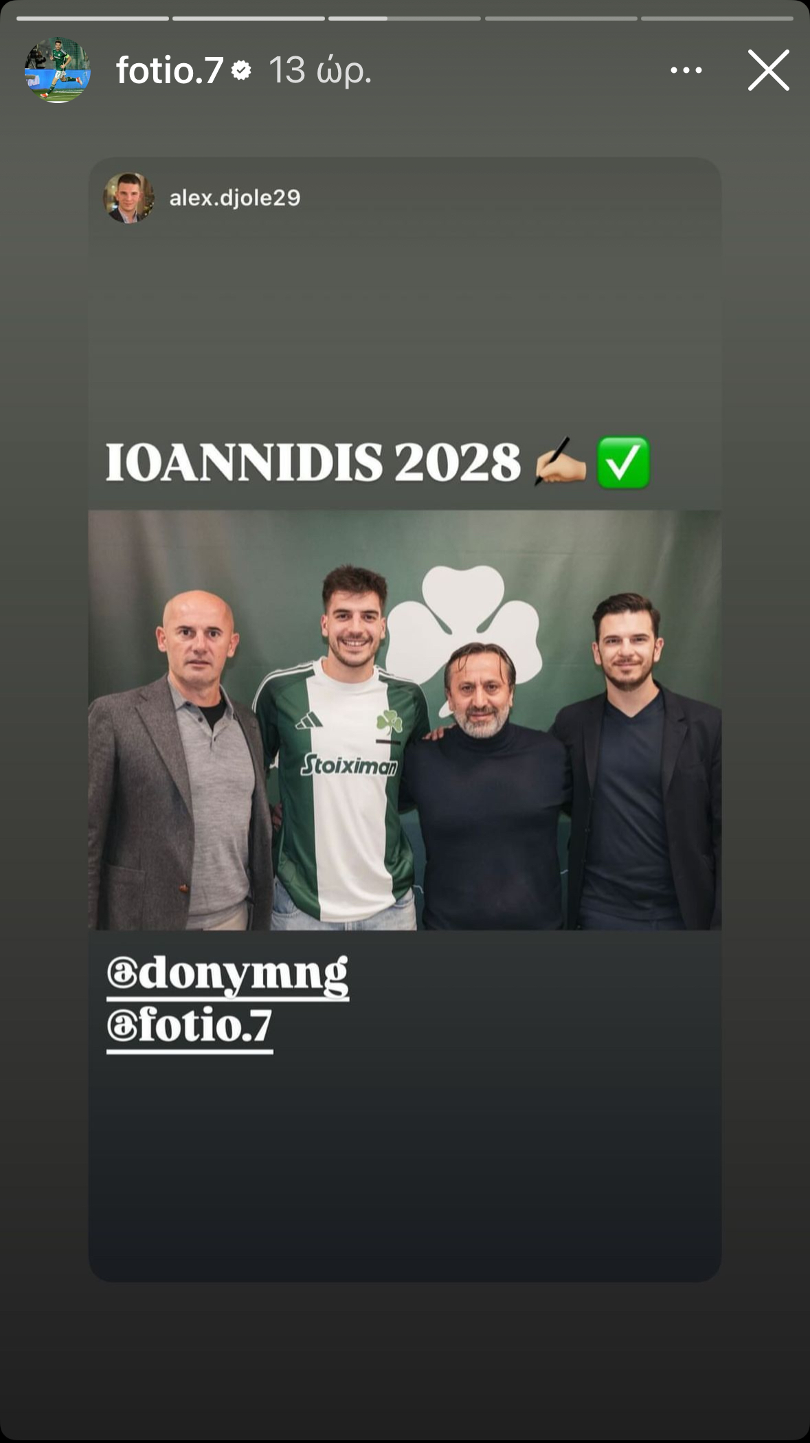 Λίγο μετά τις επίσημες ανακοινώσεις, ο αστέρας του Παναθηναϊκού ανέβασε στο προσωπικό του μια φωτογραφία που προκάλεσε αίσθηση. Πρωταγωνιστές ο Φώτης Ιωαννίδης και οι εκπρόσωποί του, Πρέντραγκ Τζόρτζεβιτς και Αντρέας Νινιάδης. Δύο άλλοτε ποδοσφαιριστές του Ολυμπιακού που τα τελευταία χρόνια μετά τη… συνταξιοδότηση ασχολούνται επαγγελματικά με το managment και την εύρεση ταλέντων. Όλοι μαζί στη φωτογραφία με φόντο το «Τριφύλλι». Ο διεθνής φορ ανέβασε τη συγκεκριμένη φωτογραφία σε story στον προσωπικό του λογαριασμό στο Instagram, με repost από τον Άλεξ Τζόρτζεβιτς. Αν μη τι άλλο μια σπάνια εικόνα!
